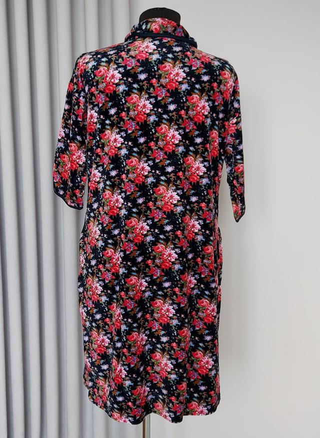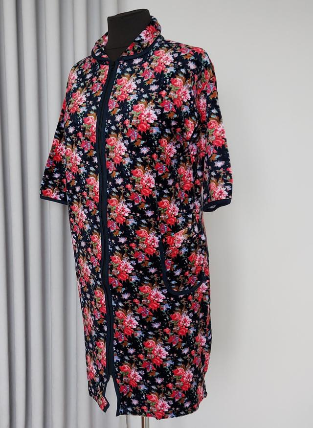 Жіночий велюровий халат з рукавами три чверті. Комір відкладений. Застібається на блискавку. Дві бічні кишені.