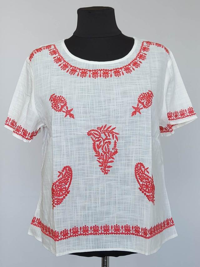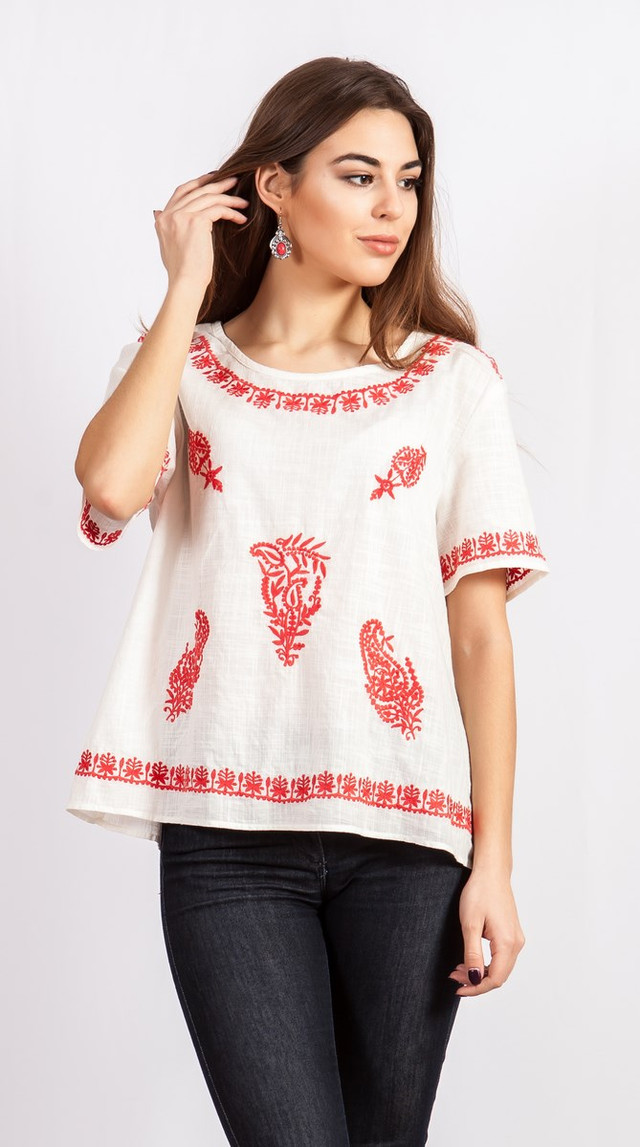 Жіноча літня блузка білого кольору з червоною вишивкою.